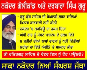 ਪੰਜਾਬ ਅਤੇ ਹਰਿਆਣਾ ਹਾਈ ਕੋਰਟ ਵਲੋਂ ਪੰਜਾਬ ਦੇ ਗ੍ਰਹਿ ਸਕੱਤਰ ਨੂੰ ਦਿੱਤੇ ਹੁਕਮ ਵਿਚ ਕਿਹਾ ਹੈ ਕਿ ਉਹ ੧੯੮੬ ਵਿਚ ਨਕੋਦਰ ਗੋਲੀ ਕਾਂਡ ਵਿਚ ਮਾਰੇ ਗਏ ਸਿੱਖ ਨੌਜਵਾਨਾਂ ਦੇ ਪਰਿਵਾਰਾਂ ਨੂੰ ਜਸਟਿਸ ਗੁਰਨਾਮ ਸਿੰਘ ਕਮਿਸ਼ਨ ਦੀ ਰਿਪੋਰਟ ਦਾ ਭਾਗ ੨ ਦੇਣ। ਉਧਰ ਪੰਜਾਬ ਦੇ ਮੁੱਖ ਮੰਤਰੀ ਕੈਪਟਨ ਅਮਰਿੰਦਰ ਸਿੰਘ ਵਲੋਂ ਪੁਲਿਸ ਦੁਆਰਾ ਅੰਨੇਵਾਹ ਗੋਲੀਬਾਰੀ ਦੀ ਤਾਜ਼ਾ ਜਾਂਚ ਦੇ ਐਲਾਨ ਨੇ ਸ਼੍ਰੋਮਣੀ ਅਕਾਲੀ ਦਲ ਦੀ ਲੀਡਰਸ਼ਿਪ ਅਤੇ ਇਸ ਦੇ ਉਮੀਦਵਾਰ ਦਰਬਾਰਾ ਸਿੰਘ ਗੁਰੂ ਅਤੇ ਚਰਨਜੀਤ ਸਿੰਘ ਅਟਵਾਲ ‘ਤੇ ਦਬਾਅ ਪਾ ਦਿੱਤਾ ਹੈ ।