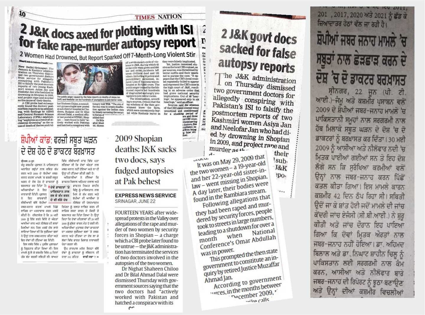 Mainstream Indian media news reports on Friday described how two J&K doctors – Dr Bilal Ahmad Dalal and gynaecologist Dr Nighat Shaheen Chilloo – allegedly fabricated evidence in the “2009 Shopian ‘rape-murder’ case” after discovery of the bodies of two young Muslim women on May 30, 2009 near a stream in Shopian, and ensuing protests directed against security personnel.A CBI probe later found that the two women were never raped or murdered, and that the two doctors were “actively working” with Pakistan and were part of a conspiracy to falsify the post-mortem report of the victims, who had actually died due to drowning.