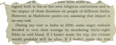 “During my visit to India in 2000, some Hindu militants decided to vent their outrage by murdering thirty-eight Sikhs in cold blood. If I hadn’t made the trip, the victims would probably still be alive. If I hadn’t made the trip because I feared what religious extremists might do, I couldn’t have done my job as president of the United States”.